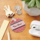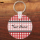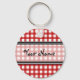 Um chaveiro com um fundo de gingham vermelho com trim preto. Personalize com seu nome na seção central.