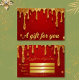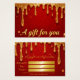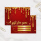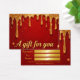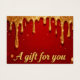 This glamorous, high-end Gift Certificate card is the ultimate way to sell your services or products! The design is ultra-luxurious, featuring a bold red background beautifully contrasted with a dramatic, sparkling gold glitter drip and confetti effect across the top and bottom. The front simply states "A gift for you" in elegant gold script, while the back provides clear fields for the Amount, To, and From, along with space for your company information. It's perfect for beauty salons, high-end boutiques, spas, and personal services looking to convey luxury.