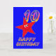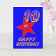 Uma pequena estrela vermelha em carregando azul do céu, um número de aniversário estrelado, trará um sorriso para uma criança de dez anos e fará cócegas no rico. Adicione o nome da criança ao dentro para personalizar este cartão de saudação de aniversário. Será um tesouro para o seu 10º aniversário especial. Design original do Anura Design Studio.