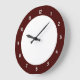 Números brancos com o relógio de parede redonda vermelho. Este trim vermelho é intercambiável ao transformá-lo em um relógio quadrado. Mantenha-o com o fundo branco ou adicione um fundo colorido. Adicione a sua foto ou design favorita atrás da imagem de trim. A maneira de fazer isso é garantir que sua foto seja mostrada abaixo do limite de imagem no lado direito quando você estiver personalizando.