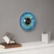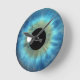Olho Azul Íris © Marte Solarino Designs. Relógio panorâmico, legal e divertido, impresso a azul, de tamanho médio, com uma imagem gráfica tendenciosa, moderna, bela, única, assustadora, estranha e retorcida de uma grande íris azul realista de globo ocular de um olho. Para ver todos os relógios de parede de olhos e olhos coloridos, clique na imagem abaixo: