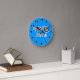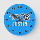 Relógio de bola de futebol com nome para meninos esportivos. Design para pequenos jogadores de futebol ou quarto de berçário. Personalize com o nome da criança. Cor de fundo personalizada é azul ou rosa para a menina. A decoração do quarto das crianças.