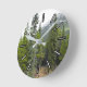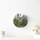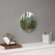 Este design de relógio mostra uma foto de uma cena de floresta com árvores coníferas, junto com uma montanha ao fundo. Também apresenta retângulos que marcam as horas.