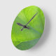 Um relógio de parede na natureza com uma imagem de uma folha próxima.