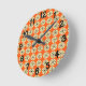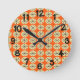 Este relógio de parede tem uma design moderna do século médio de ovais cremosos e estrelas pretas em um campo de laranja.