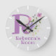 Design apresenta Monograma & Nome com Flores em ambos os lados no estilo pastel de cor de água. O nome de exemplo é Rebecca. Relógio De Quarto De Crianças. Altere o nome conforme desejado para qualquer pessoa com um nome que comece por R.