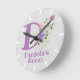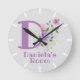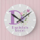 Crianças, Relógio De Quarto. Design apresenta Monograma & Nome com Flores em ambos os lados no estilo pastel de cor de água. O nome de exemplo é Daniela. Altere o nome conforme desejado para qualquer pessoa com um nome que comece com D.