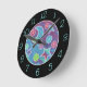 Um céu noturno de cor brilhante com estrelas brilhantes e lua listrada. Relógio com um design personalizável roxo, rosa, azul, verde e preto para você personalizar com seu próprio texto, imagens e ideias. Outras opções de estilo disponíveis. Imagem criada de um desenho de lápis de cor original por Jess Perry.