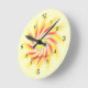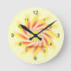 O design de girino em vermelho, laranja e amarelos, em um fundo amarelo pálido, fica atrás dos números na face do relógio. Os números 12, 3, 6 e 9 são maiores que os restantes. Personalize com seu texto (nome da empresa ou da família ou ?). É possível personalizar/editar a cor de fundo (amarelo pálido)
