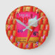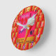 Apresenta um sinal de salão de sorvete antigo em cores cor-de-rosa, branca e laranja, com um cone de sorvete de servidor flexível. Colocada contra um fundo com um cone. Um relógio divertido para a sua cozinha ou em qualquer lugar que te sirva. Você pode mudar as cores da mão. Os números são removíveis.