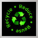 Poster preto com um símbolo de reciclagem verde rodeado por "Reduce - Reuse - Reciclar" em caracteres verdes.