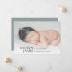 O cartão de anúncio de nascimento mínimo moderno apresenta uma fotografia horizontal ou orientada à paisagem com o nome do bebê, estatísticas de natalidade e uma assinatura de família alinhada no fundo em letras elegantes e clássicas. Adicione três fotos quadradas adicionais no verso.