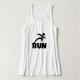 Tirando T-shirts, canecas, bolsas, guardas, topos de tanques, capuzes, e outros roupa e presentes para corredores com um corredor da silhueta preta e texto preto que lê RUN. Esses itens de roupa RUN e presentes são excelente para qualquer um que esteja treinando para um 5K, qualquer um que apenas ame correr, ou alguém que já tenha realizado várias maratonas!