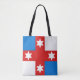 "Ataque trimestral e argent, em uma cruz gula quatro mullets de seis pontos de acordo." Crachá Populacional do Reino de Lochac na Sociedade de Anacronismo Criativo
