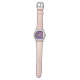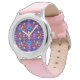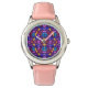 A stylish watch with a vibrant purple and floral-patterned face, set in a silver case. It features a pink leather strap, shown from front and back views.