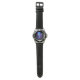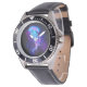 Água-viva grande, azul, desenhada artisticamente, brilhante, brilhante, com longos tentáculos sobre fundo preto com bioluminescência roxa. Água-viva luminosa.