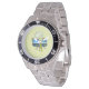 Renderização digital 3D de uma alienígena sorridente e um disco de espaço azul