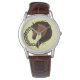 Um perfil do lado do cavalo marrom com nó celta tribal funciona em círculo num pano de fundo amarelo