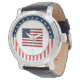 Linda bandeira americana, lancor militar patriótico, relógio de pulso. Estes relógios apresentam uma ilustração artística, uma bandeira americana no centro, e estrelas e borda estriada! Selecione na lista suspensa desta página o seu estilo de relógio e banda favorito do couro, aço inoxidável, dois tons e brilho! Escolha na mesma lista suspensa para estilos de adulto ou filho! Este relógio certamente irá adicionar algum orgulho patriótico e apoio ao seu estilo e aparência diários! Um presente maravilhoso para a família, os amigos, a família de um soldado militar, ou alguém que esteja a servir no exército ou seja veterinário! Para mais cartões patrióticos, decoração doméstica e itens de presentes, visite nosso compro!