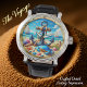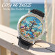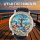 This circular wall clock features a vibrant beach scene with a prominent blue anchor wrapped in rope. A bright blue crab and various seashells, including a large pink one and several smaller multi-colored shells, are scattered on the sandy shore. In the background, white sailboats dot the blue ocean under a partly cloudy sky with seagulls flying. The clock is encased in a golden, ribbed frame.