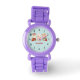 Um relógio com uma ilustração fofinha, com um coelho, um urso e um veado, todos vestidos com roupas festivas. Adorável e caprichoso.