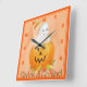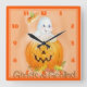 Relógio ao Quadrado do Halloween com um Fantasma branco numa Abóbora que é brilhante e colorido. Isso é num Relógio Quadrado.