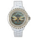 Belo relógio feminino de deco. Linda geometria, em ouro, azul, branco, turquesa e padrão retrorreflector preto com uma Dragonfly estilizada.