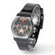 Este é um rosto de lobo decorativo feito à mão e estilizado com padrões astecas em cores preta, vermelha, turquesa e bege.