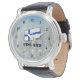 Bandeira da Finlândia, rotulada, fundo de árvores cobertas de neve