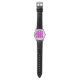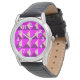 Este relógio masculino tem um design Bauhaus de triângulos sobrepostos em roxo, magenta e rosa.