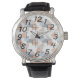 Este relógio masculino tem um design de Bauhaus repetindo retângulos, quadrados, diamantes e triângulos em cores de praia de bronzeado, cinza, azul e laranja.