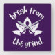 Um relógio com uma flor branca de ioga lotus, com a frase "Quebrar do Grind" centrada à volta da imagem. A design sugere uma fuga pacífica das pressões diárias, simbolizando força, resiliência e despertar espiritual.