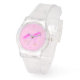 Este incrível relógio apresenta uma imagem de arte digital de um bonito unicórnio de bebê rosa-mágico. O corpo principal do unicórnio é rosa e o homem e a cauda são dois tons de rosa diferentes. O unicórnio tem cascos de ouro e uma buzina brilhante de ouro sobre sua cabeça. Tem um olho em forma de diamante rosa. O unicórnio tem um grande sorriso no seu rosto.