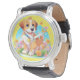Um relógio com uma fotografia de um filhote fofo sentado entre as flores. Ele parece muito feliz por estar cercado por flores e borboletas. O presente perfeito para dar àqueles que amam cachorros. Contém conteúdo generativo.