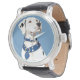Ilustração estilizada de um cão Dalmático vestindo um colar azul contra um fundo azul comum, destacando sua aparência distinta e comportamento amigável.