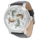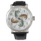 Relógio com quatro camarões no mostrador. Fundo branco e números pretos ao redor, os camarões são verdes e marrons e têm longas antenas onduladas que adicionam interesse ao design. Feito como um relógio masculino, é perfeito para um pescador de água salgada ou dono de loja de iscas, mas também serve para mulheres e crianças.