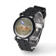 Fotografia de um caranguejo, de verdade, segurando uma flor roxa, exibida em um Relógio. Este caranguejo bebê era do tamanho de um Dime e foi fotografado numa praia.