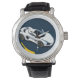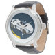 Uma ilustração colorida e futurista de um carro esportivo com carroceria azul, detalhes vermelhos e um design aerodinâmico impressionante, acompanhado por um arco amarelo ousado sobre o fundo.