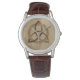 Um Classic Brown Leather Strap Watch, com uma simples triquetra Celta colorida, entrelaçada com um círculo formando um símbolo trinitário contra um fundo de madeira, representando a unidade espiritual com o divino.