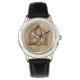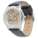 Um design de relógio Celta preto de aço inoxidável, com um simples triquetra Celta colorido, entrelaçado com um círculo formando um símbolo trinitário contra um fundo de madeira, representando a unidade espiritual com o divino.