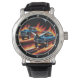 Este relógio único apresenta dois carros clássicos dirigindo através de uma paisagem feroz. As chamas vibrantes e os designs de carro elegantes criam uma tela dinâmica e atraente para os olhos. Perfeito para os entusiastas dos carros ou para quem ama acessórios ousados e distintivos, este relógio faz uma declaração em qualquer pulso.