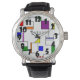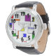 Esse relógio masculino tem um design Bauhaus de linhas indo vertical e horizontalmente para fazer uma grade com quadrados, retângulos, triângulos e círculos colocados em volta da grade. Se você gosta do design, mas prefere cores diferentes, me mande mensagem.