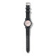 Relógio de criança bonito com coelho de coelhinho d'água espreitando ao redor da esquina e um fundo de cor d'água rosa e cinza. Altere as palavras "Você sabe que horas são?" para um nome ou escolha outra palavra ou frase.