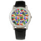 Este relógio tem um design Bauhaus de uma colagem de triângulos em vermelho, amarelo, laranja, azul e verde.
