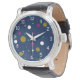 Um padrão de círculos de vários tamanhos em ouro, branco, roxo e verde está espalhado sobre um fundo azul escuro. Os círculos são espaçados uniformemente e variam de diâmetro.