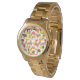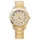 Este relógio feminino tem um design de flor escandinavo e folhas espalhadas em coral, ouro e verde-sábio.