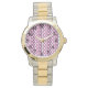 Este relógio tem uma design moderna do século médio de cordas de ovais em roxo, com ovais brancos e círculos feitos de linhas dentro.
