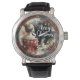 This image features a circular Watch with a watercolor-style illustration of a cozy Christmas scene. The central design shows a blonde girl with her hair in a bun, facing away from the viewer, wearing a red and white patterned sweater. On the table next to her sits a mug of hot cocoa or coffee and a glowing antique lantern. White script in the background reads "Merry Christmas". The entire scene is surrounded by a dark red and blue border featuring gold accents, holly berries, and snowflakes.