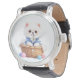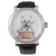 An adorable fluffy puppy sitting in a basket wearing a cute blue outfit. A soft and charming design perfect for dog lovers and kawaii fans.