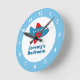 Relógio de avião de brinquedo para quarto de crianças ou berçário de bebês. design do tema da aviação. Ilustração do avião. Relógio redondo personalizado com avião e nome personalizado de criança. Boa ideia de presente de chá de fraldas ou primeiro aniversario para o quarto de garotos. Decoração de ilustração de avião com nome personalizável ou monograma. Decoração de casa para a parede do quarto das crianças. Faça seu próprio presente único para neto, sobrinho ou filho piloto.
